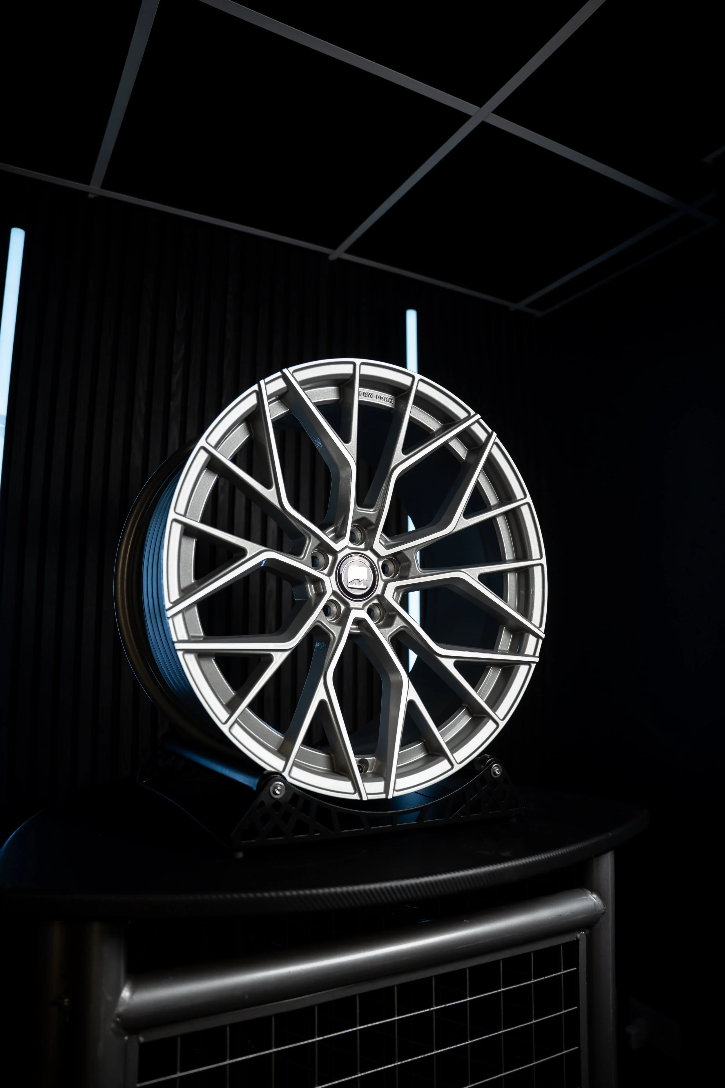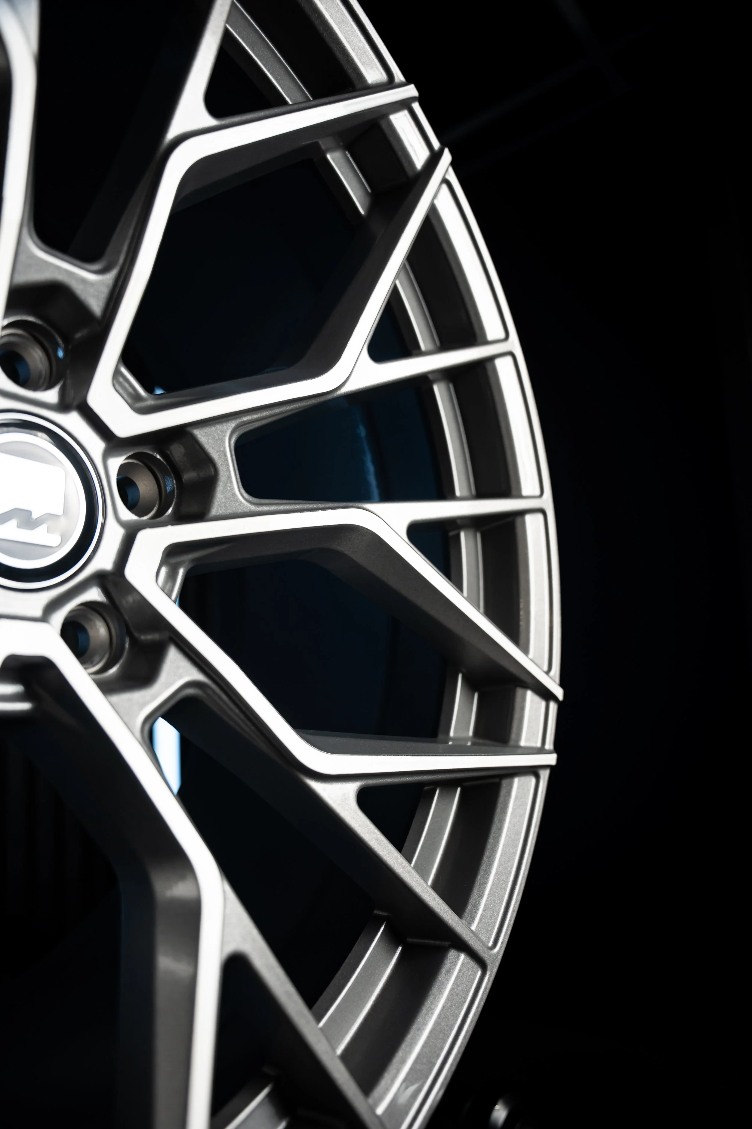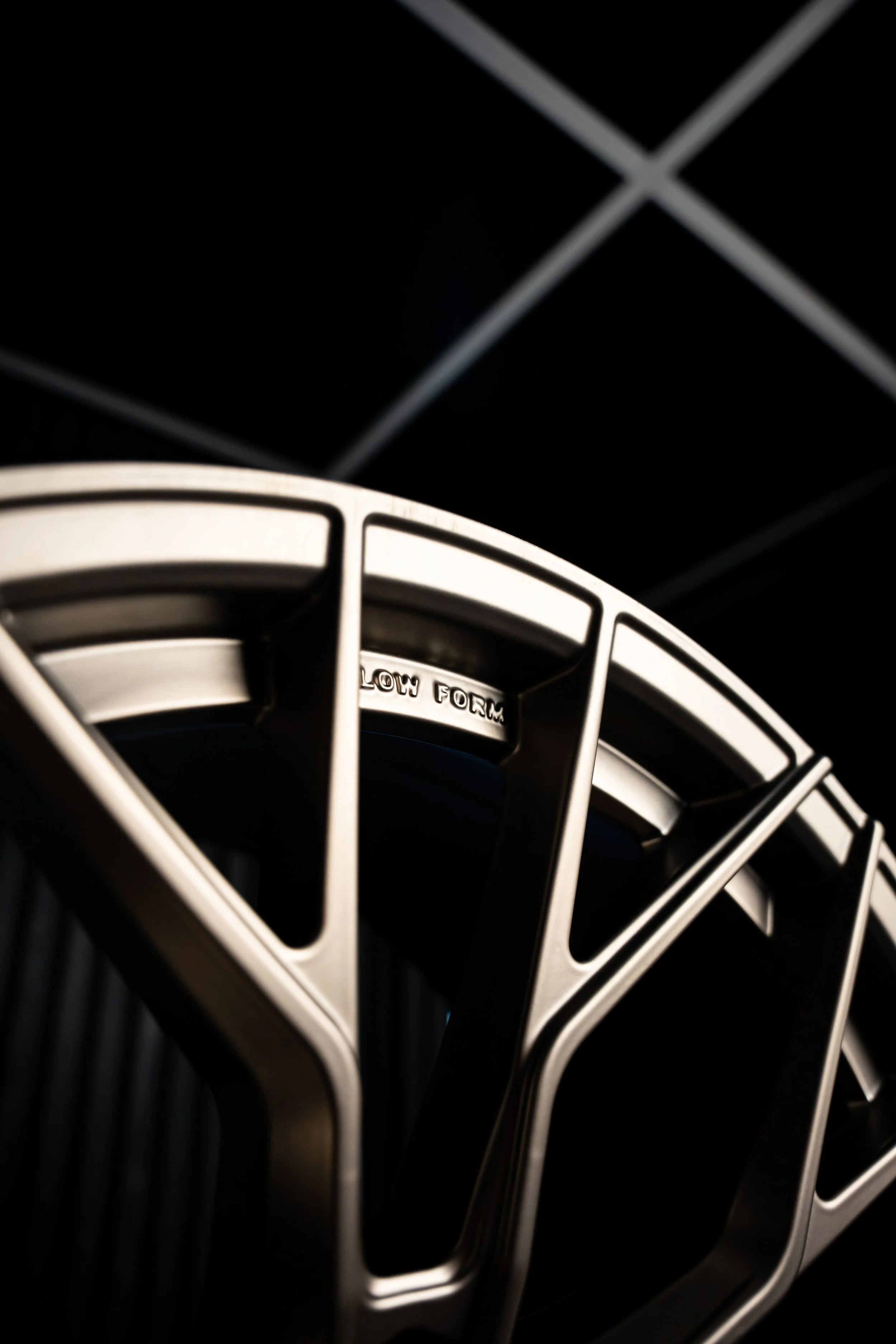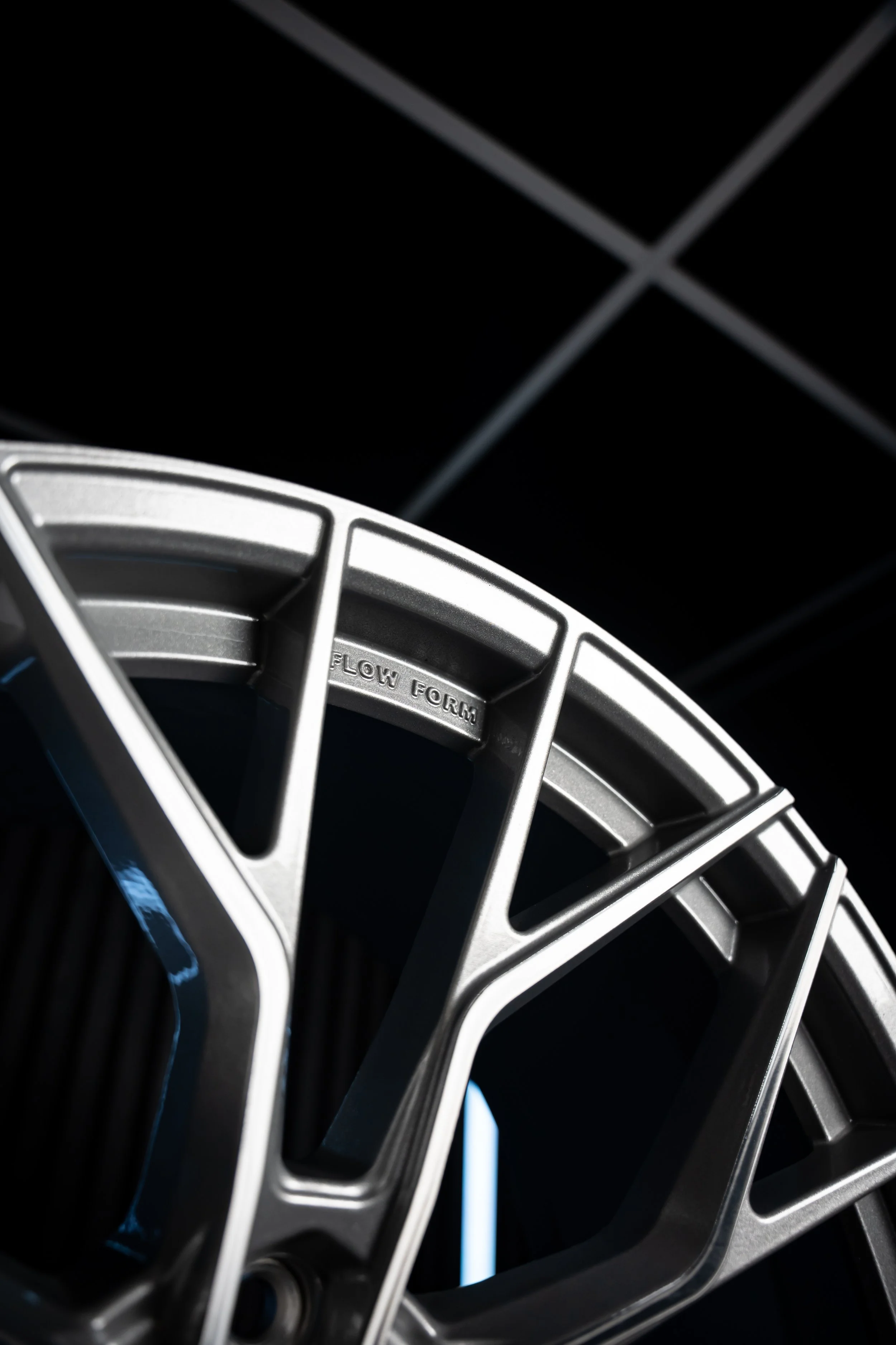 A flow formed wheel starts as a cast wheel, but is then spun at high speed while rollers apply pressure to the barrel. This stretches and compresses the aluminium, creating a much stronger and lighter structure — similar to the strength of a fully forged wheel, but at a more accessible price point.