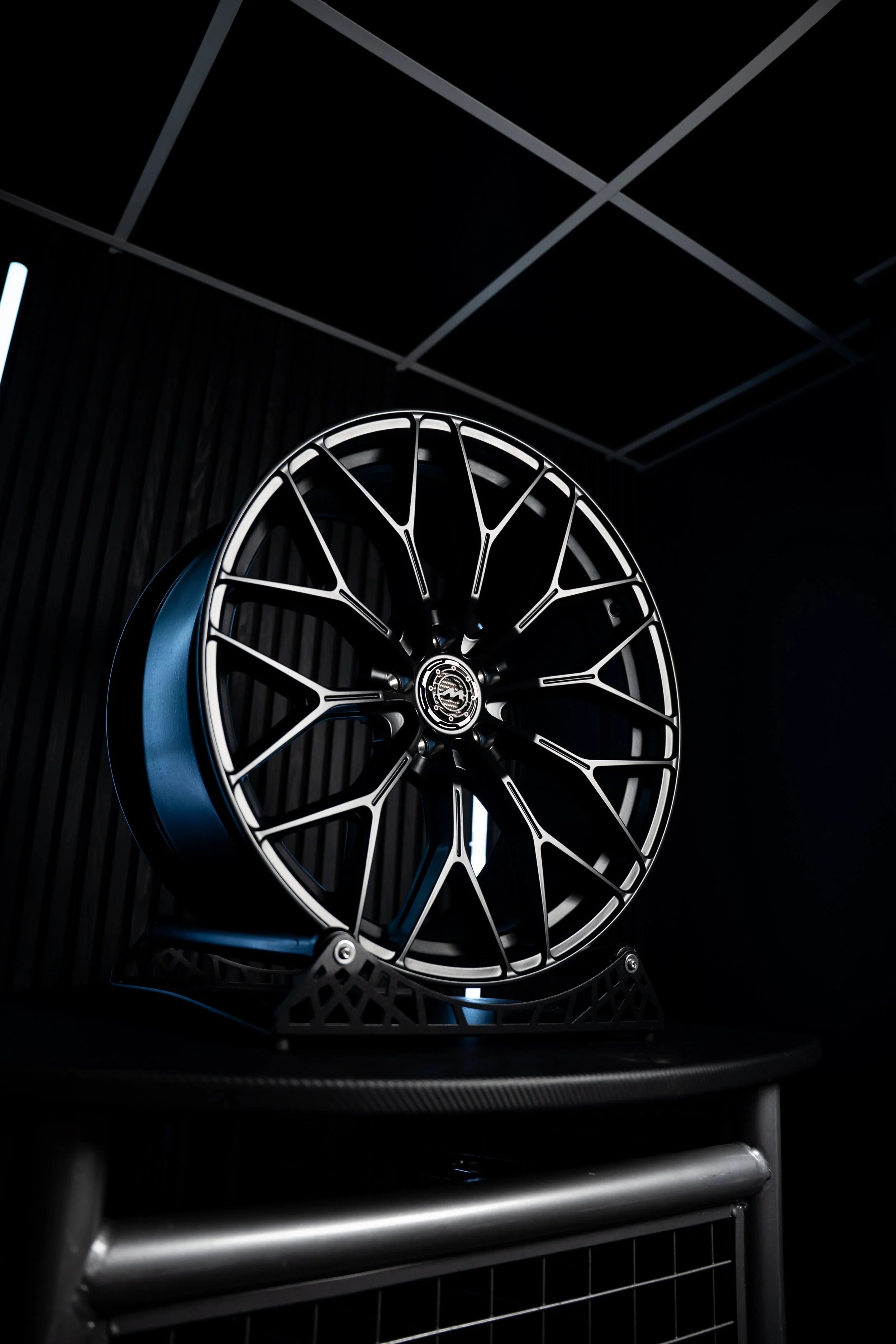 A flow formed wheel starts as a cast wheel, but is then spun at high speed while rollers apply pressure to the barrel. This stretches and compresses the aluminium, creating a much stronger and lighter structure — similar to the strength of a fully forged wheel, but at a more accessible price point.